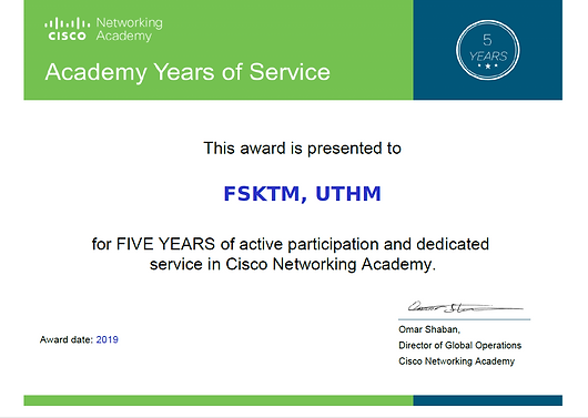 The Cisco Academy FSKTM was established since 2015 and have been awarded for FIVE YEARS of active participation and dedicated services by Cisco. Our excellence participation was assisted by skilled instructors which strengthen up our Cisco Academy. Cisco Academy FSKTM delivers a comprehensive learning experience that teaches students how to design, build, manage network, troubleshoot, and secure computer networks for increased access to career opportunities. The Cisco Academy FSKTM provides online learning material, interactive tools, and hands-on learning activities to help individuals prepare for Information and Communication Technologies (ICT) and Networking careers in every type of industry. The CCNA curriculum is offered to FSKTM student an integrated in Networking course. To support the Cisco courses, we have dedicated labs equipped with Cisco 1941 routers and Cisco Catalyst 2960 switches that can accommodate up to 35 students. We have certified more than 1000 student since 2015 until today.